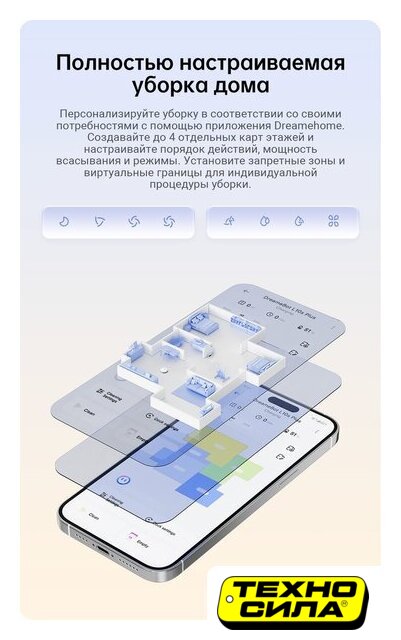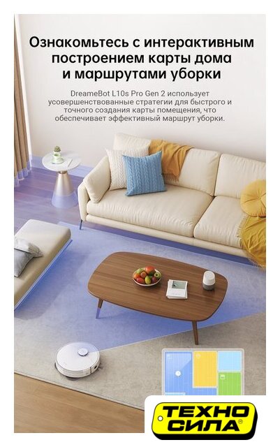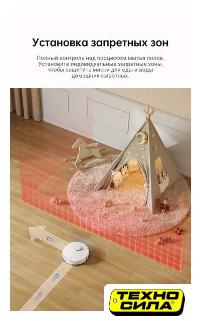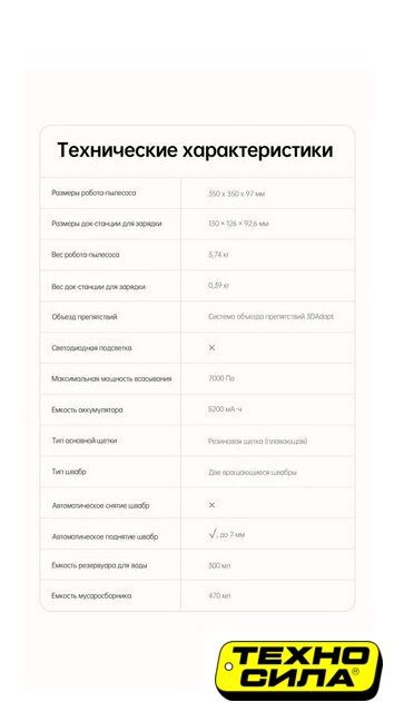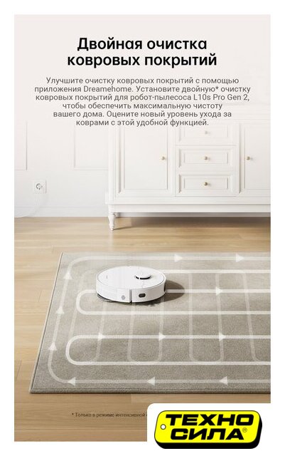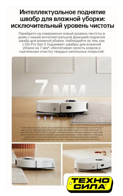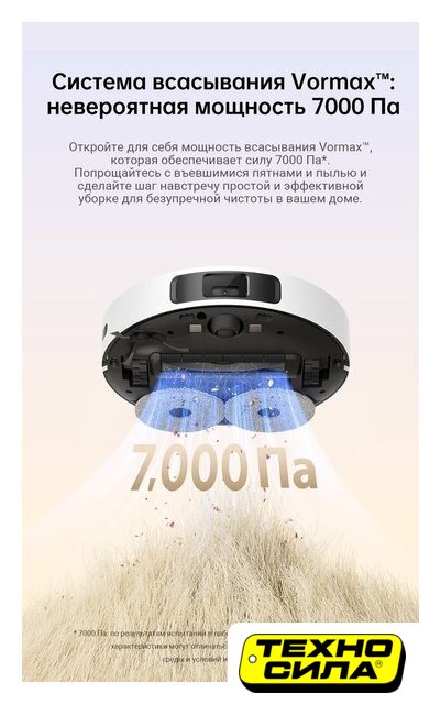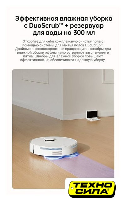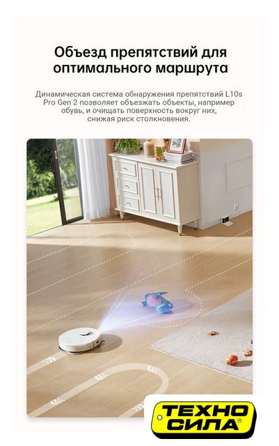 влажная уборка, фирменное приложение, сила всасывания 10000 Па, с турбощеткой, навигация: контактный бампер, лидар, датчики перепада высоты, лазерные датчики препятствий