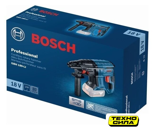 Комплект поставки | - Перфоратор GBH 180-LI Professional- Дополнительная рукоятка 1 602 025 08X- Салфетка (№ запасной части 1 619 200 413);- Ограничитель глубины 1 613 001 003%- Коробка |