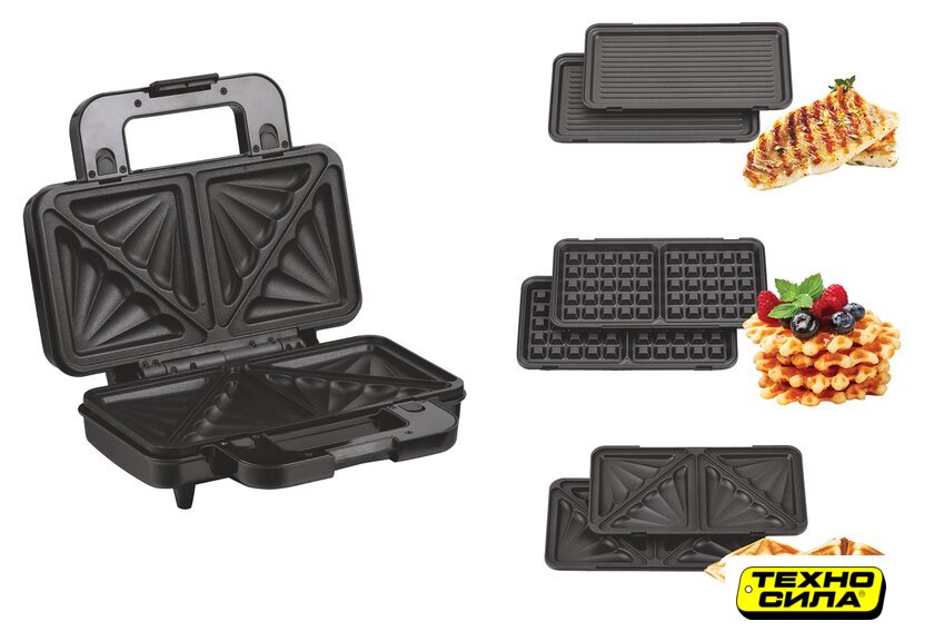 многофункциональная сэндвичница, 700 Вт, поверхность: гриль-пластина/форма для 2 ломтиков хлеба/вафельница, съемные плитки, вид выпечки: венские (бельгийские) вафли/гриль/сэндвич, черный/серебристый