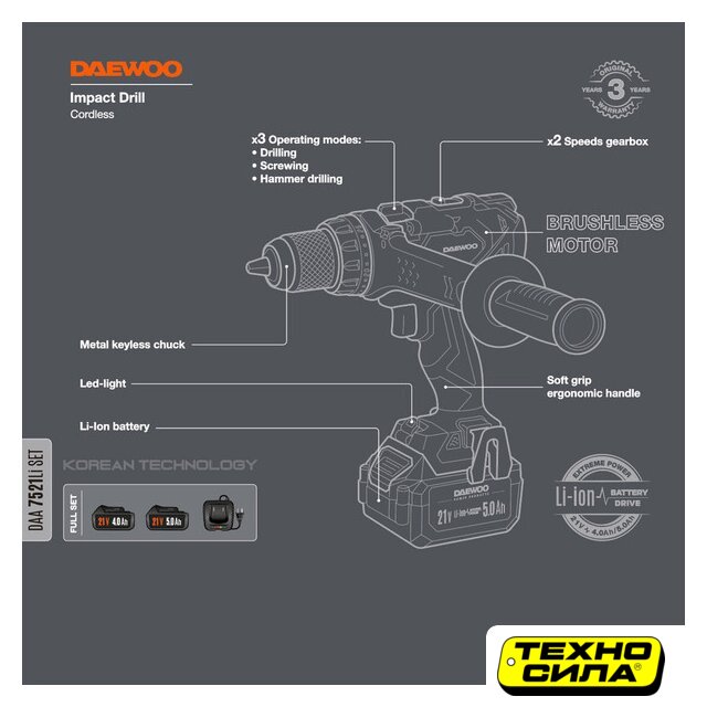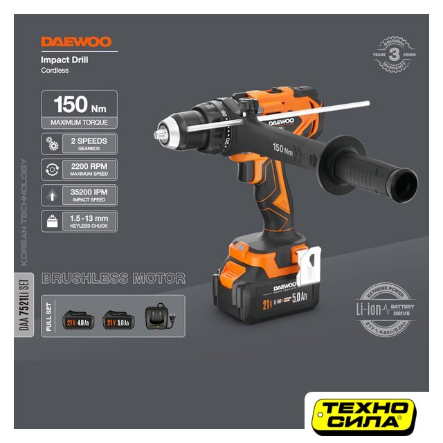 | Комплектация | - Дрель-шуруповерт - 1 шт.- Аккумулятор 4,0 Ач - 1 шт.- Аккумулятор 5,0 Ач - 1 шт.- Зарядное устройство - 1 шт.- Дополнительная рукоятка - 1 шт.- Скоба для крепления - 1 шт.- Инструкция- Кейс |
