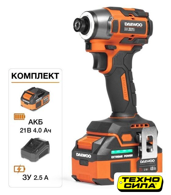 питание: аккумуляторный, Li-ion, 3300 об/мин, 250 Н·м, напряжение аккумулятора: 21 В, ёмкость аккумулятора: 2.5 А·ч, аккумулятор в комплекте, 1370 г