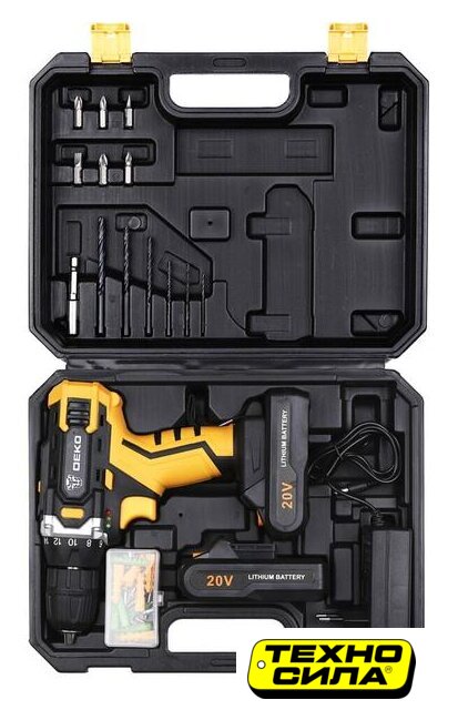 | Комплектация | Дрель-шуруповерт - 1 шт.Аккумулятор - 2 шт.Зарядное устройство - 1 шт.ИнструкцияКейсБиты - 6 штСверла - 6 штУдлинитель бит - 1 штНабор крепежа - 50 шт |