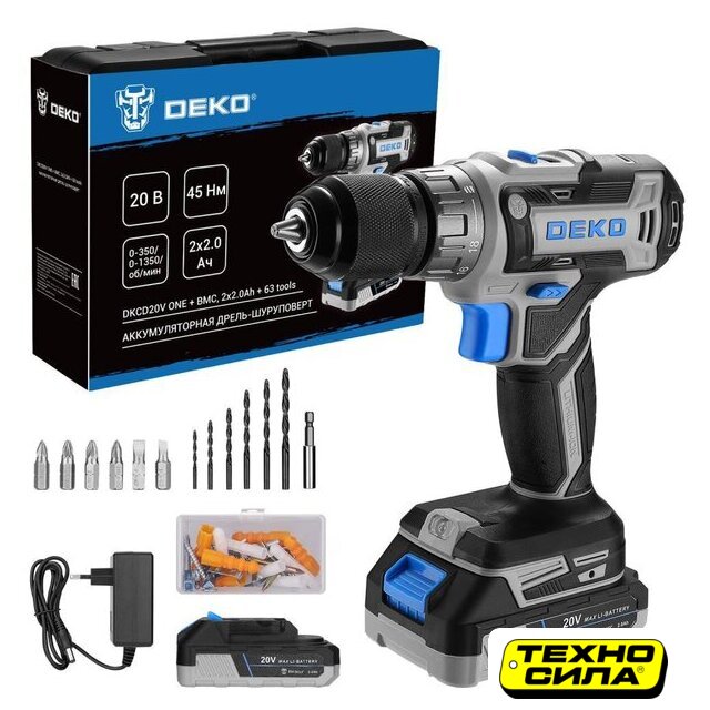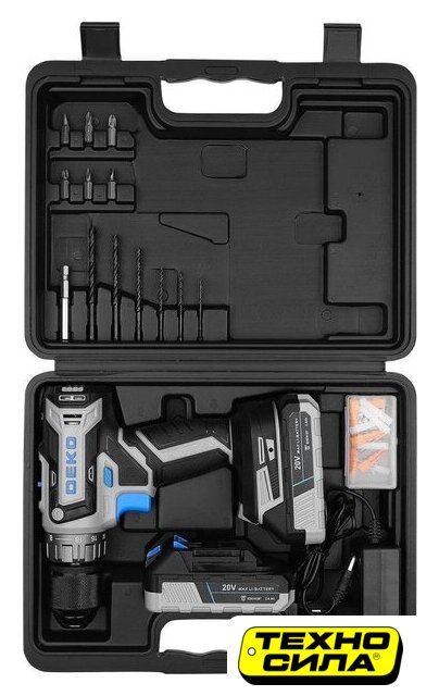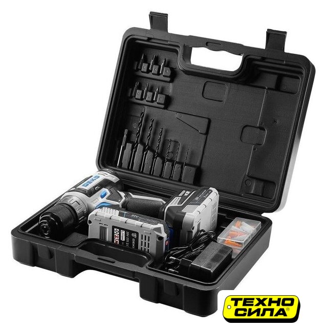 | Комплектация | - Дрель-шуруповерт аккумуляторная - 1 шт.- Аккумулятор - 2 шт.- Зарядное устройство - 1 шт.- Сверла - 6 шт.- Биты - 6 шт.- Магнитный держатель бит - 1 шт.- Комплект крепежа - 50 шт.- Руководство по эксплуатации - 1 шт.- Кейс - 1 шт. |