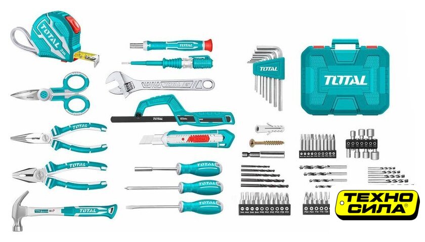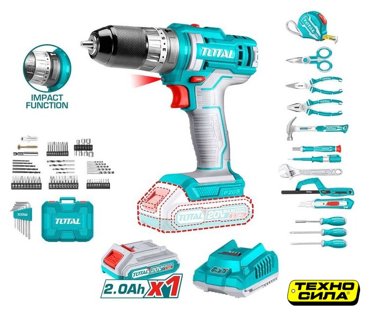 | Комплектация | Ударная дрель-шуруповерт TOTAL TIDLI20035 - 1 шт.Аккумулятор TFBLI20011 2,0 Ач - 1 шт.Зарядное устройство TFCLI2001 - 1 шт.Молоток с гвоздодером 230 гр - 1 шт.Отвертка SL5.5x100 - 1 шт.Отвертка PH1x100 - 1 шт.Комбинированные плоскогубцы 7" - 1 шт.Длинногубцы 6" - 1 шт.Разводной ключ 8" - 1 шт.Индикаторная отвертка - 1 шт.Рулетка 3 м - 1 шт.Нож с сегментным лезвием - 1 шт.Рукоятка отвертки 1/4" 100 мм - 1 шт.Рукоятка прецизионной отвертки 4 мм - 1 шт.Прецизионные биты для отвертки (SL1.5, SL2, SL3, PH000, PH00, PH0, T6, T8, H1.5, H2.5) - 10 шт.Ножницы электрика 5.5" - 1 шт.Мини-ножовка - 1 шт.Шестигранные ключи (1.5, 2, 2.5, 3, 4, 5, 5.5, 6 мм) - 8 шт.Сверл по камню (4, 5, 6, 8, 10 мм) - 5 шт.Спиральные сверла (2, 3, 4, 5, 6 мм) - 5 шт.Сверла по дереву (4, 5, 6, 8 мм) - 4 шт.Биты 25 мм (SL3, SL4, SL5, SL6, PH0, PH1, PH2, PH3, PZ0, PZ1, PZ2, PZ3, T10, T15, T20, T30, H3, H4, H5, H6) - 20 шт.Биты 50 мм (SL4, SL5, SL6, PH1, PH2, PH3, T10, T15, T20, T30) - 10 шт.Торцевые насадки Cr-V (5, 6, 7, 8, 9, 10, 11 мм) - 7 шт.Магнитный держатель бит - 1 шт.Винты ST3.5 - 20 штВинты ST4 - 10 шт.Винты ST5 - 10 шт.Пластиковых дюбеля 5 мм - 20 шт.Пластиковых дюбеля 6 мм - 10 шт.Пластиковых дюбеля 8 мм - 10 шт.Пластиковый кейс |