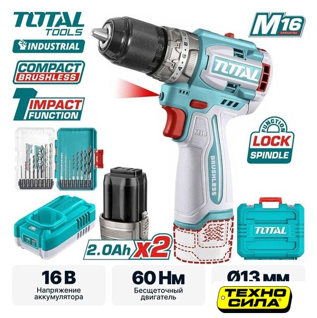 | Комплектация | - Бесщеточная дрель-шуруповерт - 1 шт.- Аккумулятор 2,0 Ач TFBLI1620 - 2 шт.- Зарядное устройство 1,3 А TFCLI1613 - 1 шт.- Сверла по металлу, дереву, бетону в кейсе - 16 шт.- Инструкция- Кейс |