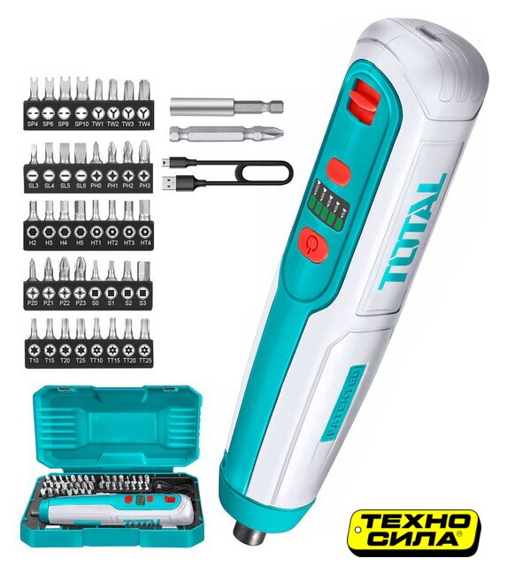 | Комплектация | - Бита (25 мм) - 40 шт.- Биты (50 мм) - 1 шт.- Магнитный держатель бит - 1 шт.- Кабель Micro USB для зарядки - 1 шт.- Инструкция- Кейс |