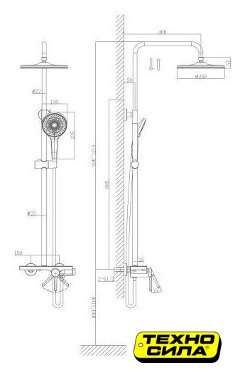 Диаметр (ширина) верхнего душа | 250 мм |