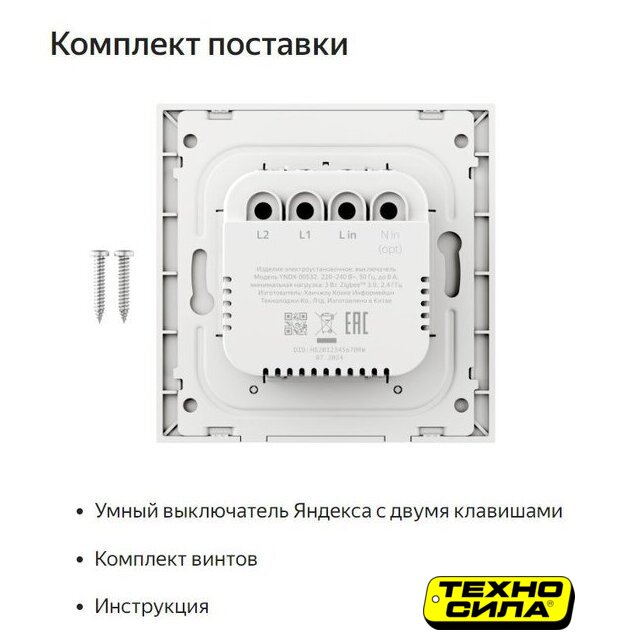 Комплектация | Умный выключатель Яндекса с двумя клавишамиКомплект винтовИнструкцияДокументы |