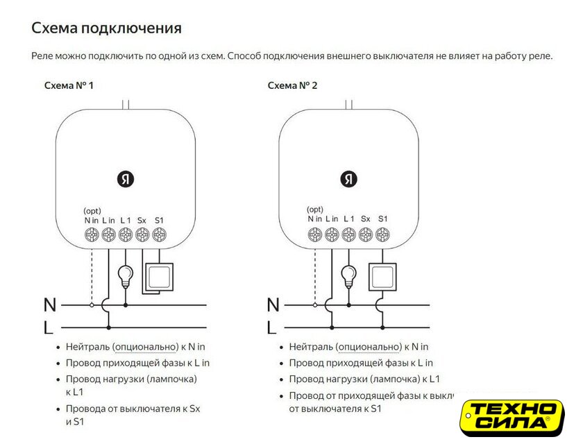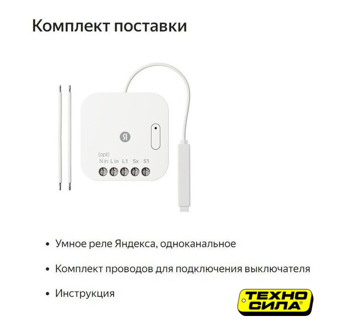 Комплектация | Умное реле Яндекса, одноканальноеКомплект проводов для подключения выключателяИнструкция |