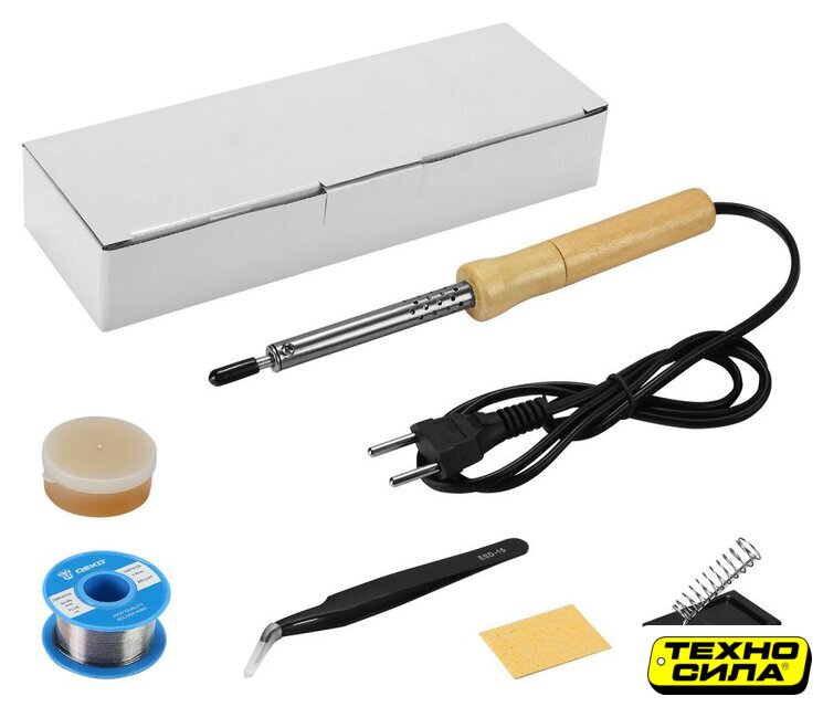 Комплектация | - Паяльник 30 Вт, 220 В- Подставка для паяльника- Губка для очистки паяльного жала- Пинцет- Припой на катушке- Канифоль- Коробка |
