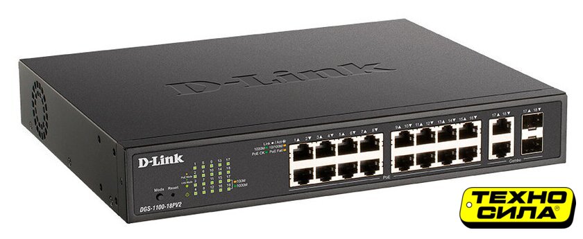 управляемый 2-го уровня, стоечный, матрица 8.8 Гбит/с, 16x100Mbit, 2xGbit/SFP, PoE