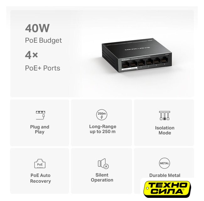 | Характеристики портов PoE | RJ45Стандарты: 802.3af/atПорты с поддержкой PoE: 1–4Общий бюджет PoE: 40 Вт |
