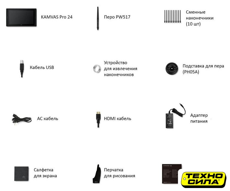 Комплект поставки | - перо PW517;- сменные наконечники (10 шт.);- кабель USB;- устройство для смены наконечников;- подставка для пера;- адаптер и кабель питания;- HDMI кабель;- салфетка для экрана;- перчатка для рисования;- документация; |