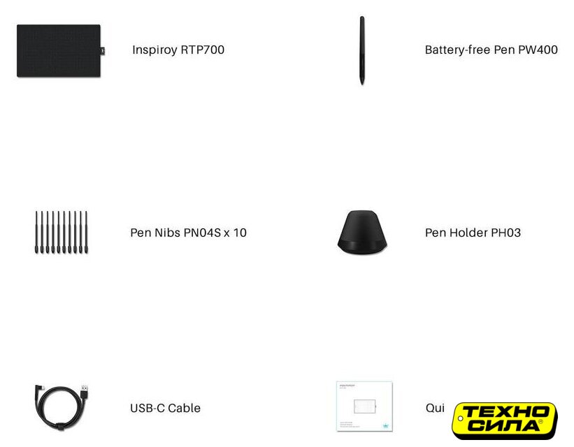 Комплект поставки | Графический планшет - 1 штРучка-дигитайзер PW400 - 1 штНаконечники для ручки - 10 штПодставка под перо с встроенным устройством для замены наконечников - 1 штКабель (USB-USB Type-C) - 1 штРуководство по эксплуатации - 1 штГарантийный талон - 1 штИнформационный вкладыш - 1 шт |