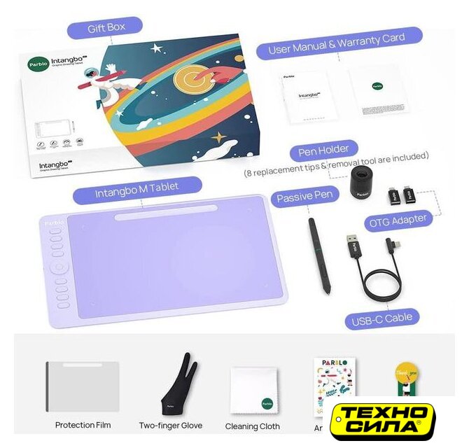 Комплект поставки | − графический планшет Intangbo M− пассивное цифровое перо P08− подставка для пера− 8 запасных наконечников для пера− кабель USB Type-C− два адаптера OTG для смартфонов (Micro-USB и USB Type-C)− перчатка− ткань для чистки− инструкция пользователя− гарантийный талон |