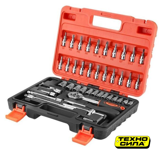 | Комплектация | - 21 шт. биты: - Плоские: 4, 5.5, 7 - PH: 1, 2, 3 - PZ: 1, 2 - T: 10, 15, 20, 25, 30, 40 - H: 3, 4, 5, 6, 7, 8- 1 шт. Насадка для головок.- 13 шт. Торцевые головки 4мм., 4,5мм., 5мм., 5,5мм., 6мм., 7мм., 8мм., 9мм., 10мм., 11мм., 12мм., 13мм.,14мм.- 3 шт. Ключи имбусовые (шестигранные) 1,5мм., 2мм., 2,5мм.- 1 шт. Отвертка для бит 150 мм.- 1 шт. Шарнир карданный для головок- 1 шт. Вороток для головок 105мм.- 2 шт. Удлинитель для головок 50мм., 100мм.- 1 шт. Трещотка 150 мм.- 1 шт. Гибкий удлинитель для головок 150 мм. |