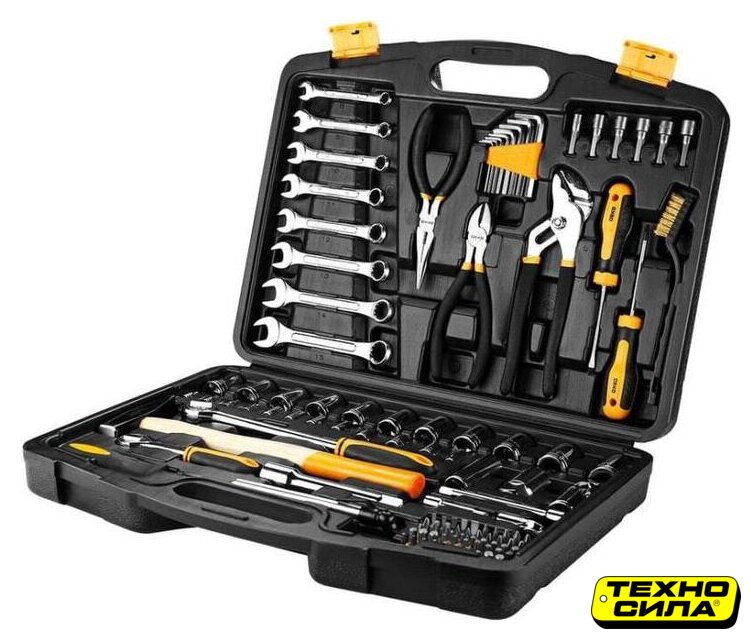 | Комплектация | - 8 шт. комбинированные ключи,- 1 шт. бокорезы,- 1 шт. плоскогубцы с длинным носом,- 8 шт. шестигранные ключи,- 1 шт. переставной ключ,- 2 шт. отвертки,- 1 шт. щетка,- 6 шт. бита шестигранная,- 1 шт. быстросменная отвертка с трещоткой,- 1 шт. тестер давления в шинах,- 1 шт. молоток,- 2 шт. трещотка,- 25 шт. головки,- 3 шт. удлинитель,- 2 шт. универсальный шарнир,- 50 шт. биты: SL3,3,4,5,6, PH0,0,1,1,2,2,3,3, PZ0,0,1,1,2,2,3,3, H1.5,1.5,2,2,3,4,4,5,5,5.5,6,6, T10,15,20,25,27,30,35, S0,0,1,1,2,2,3,3 |