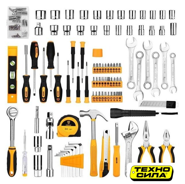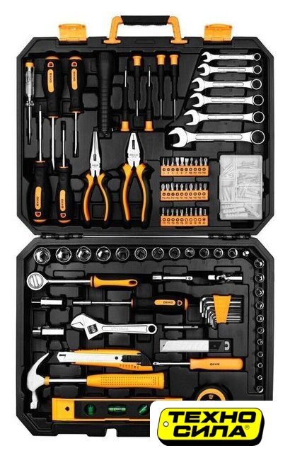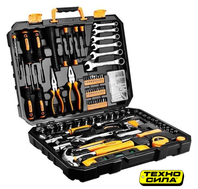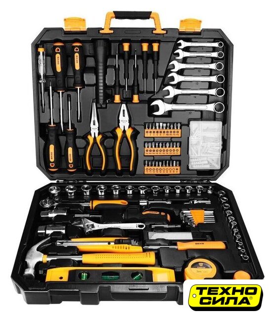 | Комплектация | Отвертка индикаторная 100-220ВОтвертки PH1х75; PH2х100; SL5х75; SL6х100 ммФонарикДлинногубцы 6"Плоскогубцы 6"Отвертки PH000; PH00; PH0; SL2.4; SL3.0Биты SL3; SL4; SL5; SL6; SL6; SL7Биты PH0; PH1; PH2; PH2; PH2; PH3; PH3Биты PZ0; PZ1; PZ2; PZ2; PZ2; PZ3; PZ3Биты H3; H4; H5; H6; T10; T15; T20; T25; T30; ADКлючи 8; 10; 12; 13; 14; 17ммДержатель головок 1/4"Адаптер 1/4"x3/8"1/4" головки 4; 5; 6; 7; 8; 9; 10; 11; 12; 13 мм3/8" головки 10; 11; 12; 13; 14; 15; 16; 17; 19; 20; 21; 22 мм3/8" Головки свечные 16 мм; 21 ммУдлинитель 3/8"х3"Карданный шарнир 3/8"Трещотка 3/8"Отвертка-держатель 1/4"Ключ шестигранный 1,5; 2; 2,5; 3; 4; 5; 5,5; 6 ммОтвертка-держатель 6,35 ммКлюч разводной 6"Набор лезвий для ножа строительного (10 шт.)Нож строительный 18 ммМолоток 8"Уровень 9"Рулетка 3 мМагнитный держатель для бит 1/4"Комплект крепежа по дереву 104 шт.Отвертки прецизионные PH0, PH00, PH000; SL2.4, 3.0Насадка на молотокКомбинированные ключи 8, 10, 12, 13, 14, 17 ммКейс |