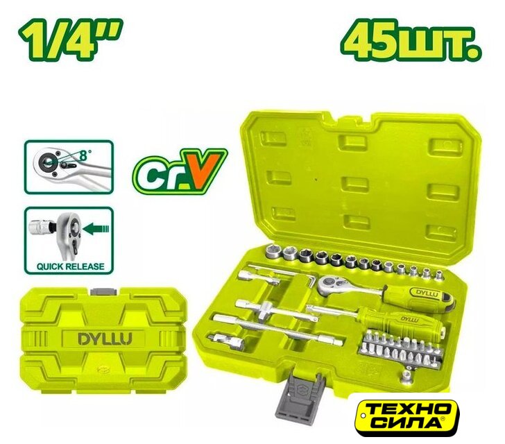 | Комплектация | Ключ-трещотка 1/4", 45T - 1 шт. Торцевые головки 1/4" (4 / 4,5 / 5 / 5,5 / 6 / 7 / 8 / 9 / 10 / 11 / 12 / 13 / 14 мм) - 13 шт. Универсальный шарнир 1/4" - 1 шт. удлинитель 1/4" (50 мм и 100 мм) - 2 шт. Вороток 1/4" 150 мм - 1 шт. Биты PZ0 / PZ1 / PZ2 / PZ3 / T10 / T15 / T20 / T30 / H3 / H4 / H5 / H6 / SL3 / SL4 / SL5 / SL6 / PH0 / PH1 / PH2 / PH3 - 20 шт. Держатель для бит - 1 шт. Гибкий удлинитель 1/4" 150 мм - 1 шт. Трехсторонний адаптер 1/4" - 1 шт. Шестигранный ключ 1.5 / 2,0 / 2.5 / 3.0 мм - 4 шт. Кейс |
