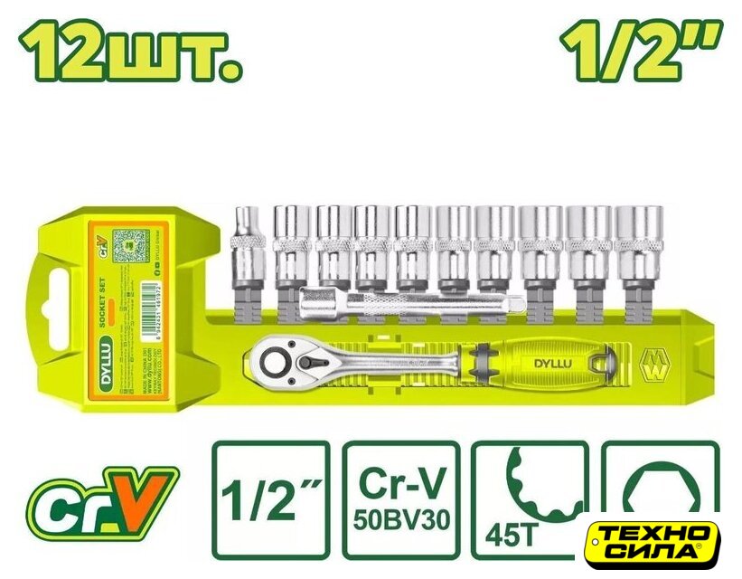 | Комплектация | Трещотка 45T 1/2" - 1 шт.Торцевые головоки 3/8" (10, 11, 12, 13, 14, 15, 17, 19, 21, 24 мм) - 10 шт.Удлинитель 1/2" (75 мм) - 1 шт.Пластиковый подвес для хранения |