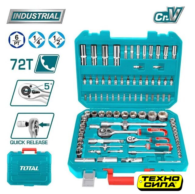 | Комплектация | Торцевые головки 1/2" (10 / 11 / 12 / 13 / 14 / 15 / 16 / 17 / 18 / 19 / 20 / 21 / 22 / 23 / 24 / 27 / 30 / 32 мм) - 18 шт. Торцевае головки 1/2", глубокая 77 мм (14 / 15 / 17 / 19 мм) - 4 шт. Торцевае головки 1/4" (4 / 4,5 / 5 / 5,5 / 6 / 7 / 8 / 9 / 10 / 11 / 12 / 13 / 14 мм) - 1 шт. Торцевае головки 1/4", глубокая 50 мм (6 / 7 / 8 / 9 / 10 / 11 / 12 / 13 мм) - 8 шт. Вороток с трещоткой 1/4", 72T - 1 шт. Вороток с трещоткой 1/2", 72T - 1 шт. Торцевае головки-биты 1/4"x32 мм (H3 / H4 / H5 / H6 / T8 / T10 / T15 / T20 / T25 / T30 / SL4 / SL5,5 / SL7 / PH1 / PH2 / PZ1 / PZ2) - 17 шт. Биты 5/16"x30 мм (H8 / H10 / H12 / H14 / SL8 / SL10 / SL12 / PZ3 / PZ4 / PH3 / PH4 / T40 / 45 / 50 / 55) - 15 шт. Свечные головки (16 и 21 мм) - 2 шт. Удлинитель 1/2" (125 и 250 мм) - 2 шт. Удлинитель 1/4" (50 и 100 мм) - 2 шт. Универсальный шарнир 1/2" - 1 шт. Универсальный шарнир 1/4" - 1 шт. Скользящая Т-образная планка 1/4", 114 мм - 1 шт. Скользящая Т-образная планка 1/2", 150 мм - 1 шт. Гибкий удлинитель 1/4", 150 мм - 1 шт. Адаптер для бит 1/4", 1/4"*25 мм - 1 шт. Трехходовой адаптер F3/8"xM1/2" - 1 шт. Переходник 1/2", 1/2"x5/16" - 1 шт. Шестигранные ключи (1,5 / 2 / 2,5 мм) - 3 шт. Кейс |