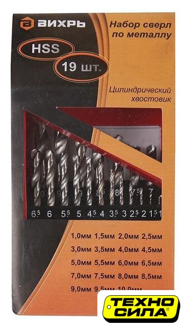 | Комплектация | Набор сверл по металлу, 1-10мм (через 0,5мм), HSS, 19шт., металл. коробка, цилиндрический хвостовик Вихрь – Набор из 19 свёрл с шагом через 0,5 мм, от 1 мм. до 19 мм. |