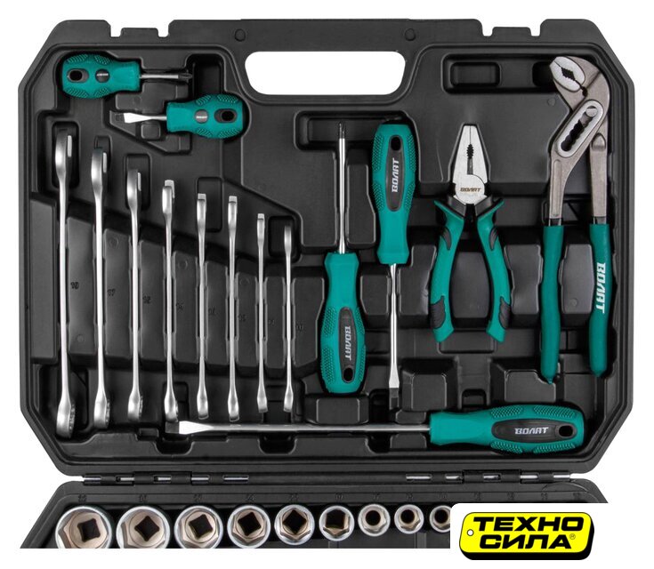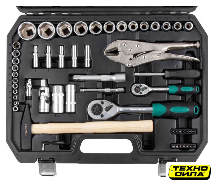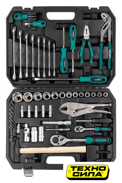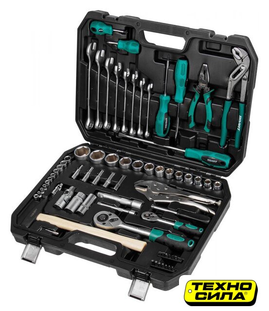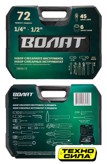| Комплектация | Головка торцевая 1/4": 5, 6, 7, 8, 9 мм;Головка торцевая длинная 1/4": 6, 7, 8, 9, 10, 11, 12, 13 мм;Головка торцевая 1/2": 10, 11, 12, 13, 14, 15, 17, 19, 22, 24, 27, 30, 32 мм;Свечная головка 1/2": 16, 21 мм;Насадка 1/4" TORX: T10, T15, T20, T25, T27, T30, T40;Насадка 1/4" PH: PH1, PH2, PH3;Насадка 1/4" SL: SL3, SL4, SL5, SL6;Трещотка 1/4";Переходник (держатель для бит) 1/4"х1/4"(HEX);Удлинитель 1/4" 75 мм;Кардан 1/4";Вороток-отвертка 1/4" 150 мм;Трещотка 1/2";Удлинитель 1/2" 125 мм;Кардан 1/2";Ключ комбинированный: 10, 11, 12, 13, 14, 15, 17, 19 мм;Ключ шестигранный Г-обр.: 1.5, 2, 2.5 мм;Отвертки: PH2x38, PH2x100, PH3х150; SL6x38, SL6x100, SL8x200;Плоскогубцы 160 мм;Клещи переставные 250 мм;Зажим с фиксатором 250 мм;Молоток с деревянной рукояткой 300 г;Кейс |