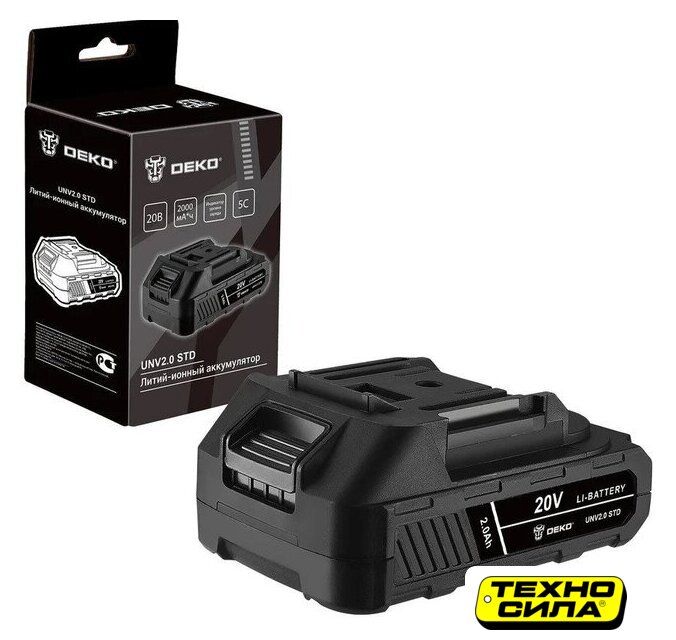 Li-ion, для строительного инструмента, совместим с Deko, 20 В, 2 А·ч, с индикатором заряда, 1 аккумулятор в наборе, 350 г