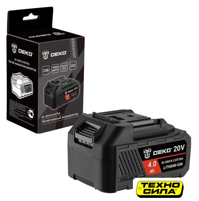 Li-ion, для строительного инструмента, совместим с Deko, 20 В, 4 А·ч, с индикатором заряда, 1 аккумулятор в наборе, 620 г