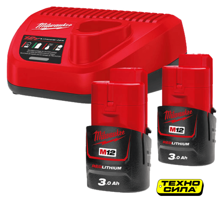 Li-ion, для строительного инструмента, совместим с Milwaukee, 12 В, 2 А·ч, с индикатором заряда, 2 аккумулятора в наборе, напряжение зарядного устройства: 12 В