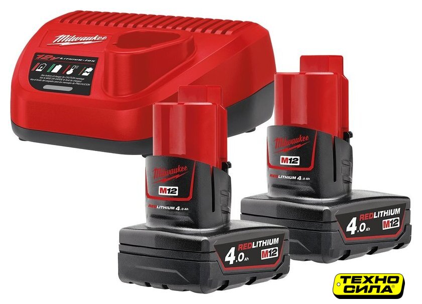Li-ion, для строительного инструмента, 12 В, 4 А·ч, с индикатором заряда, 2 аккумулятора в наборе, напряжение зарядного устройства: 12 В