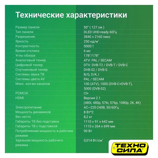 50" 3840x2160 (4K UHD), матрица VA, частота матрицы 60 Гц, Smart TV (Android), Wi-Fi