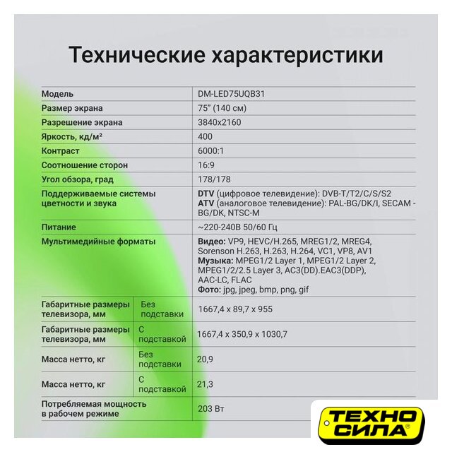 | ТВ-тюнер | аналоговый, DVB-C, DVB-T, DVB-T2, DVB-S/S2 |