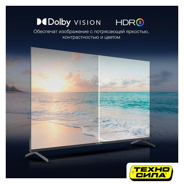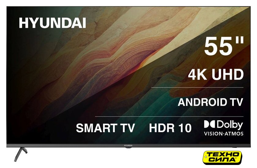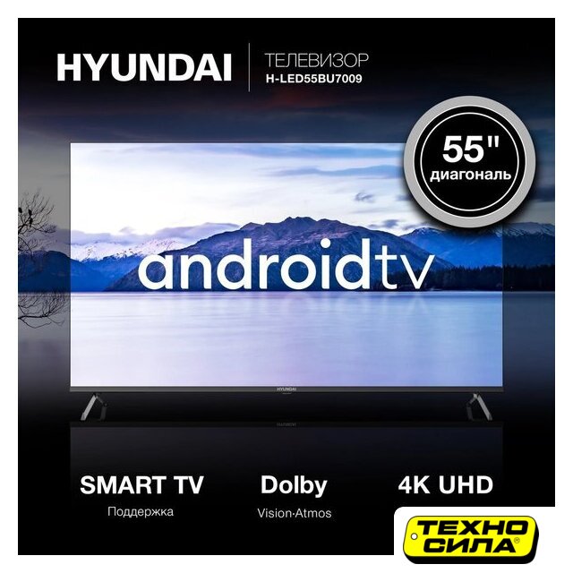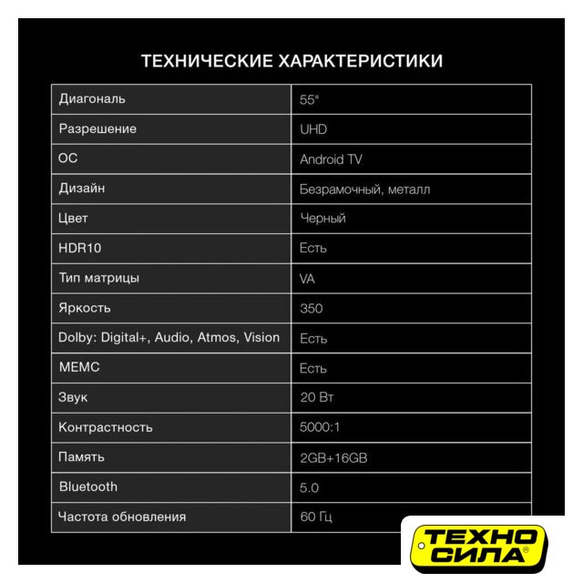 55" 3840x2160 (4K UHD), матрица VA, частота матрицы 60 Гц, Smart TV (Android), HDR10, HDR10+, Dolby Vision, Dolby Atmos, Wi-Fi, смарт пульт