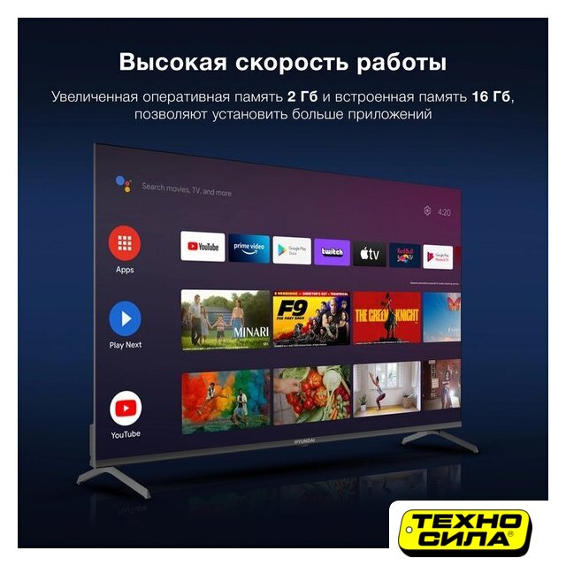 55" 3840x2160 (4K UHD), частота матрицы 60 Гц, Smart TV (Android TV), HDR10, HLG, DTS:HD, DTS:X, Wi-Fi, смарт пульт