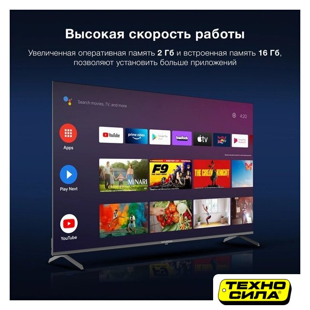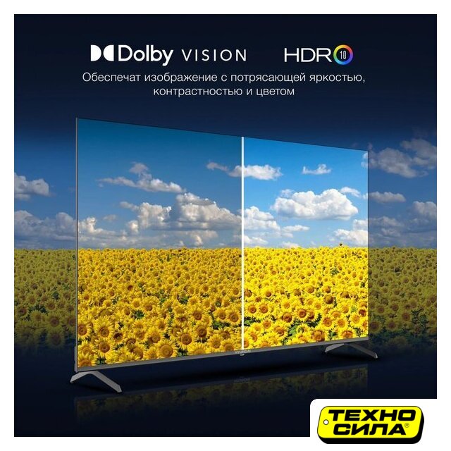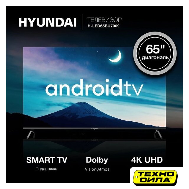 65" 3840x2160 (4K UHD), матрица VA, частота матрицы 60 Гц, Smart TV (Android), HDR10, HDR10+, Dolby Vision, Dolby Atmos, Wi-Fi, смарт пульт