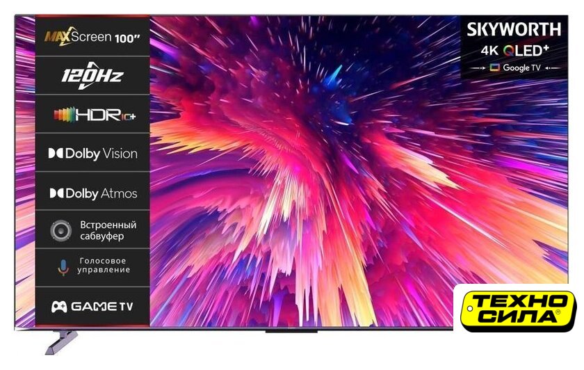 100" 3840x2160 (4K UHD), частота матрицы 144 Гц, Smart TV (Google TV), HDR10, HDR10+, Dolby Vision, HLG, Dolby Atmos, Wi-Fi, смарт пульт