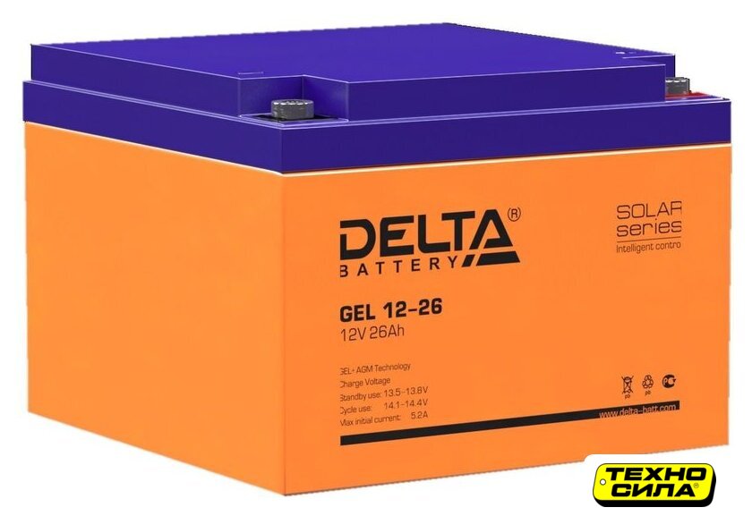 AGM, 12 В, 26 А·ч, макс. ток 300 А, клеммы T12, 166x175x125 мм, 9.2 кг, срок службы: 6 лет