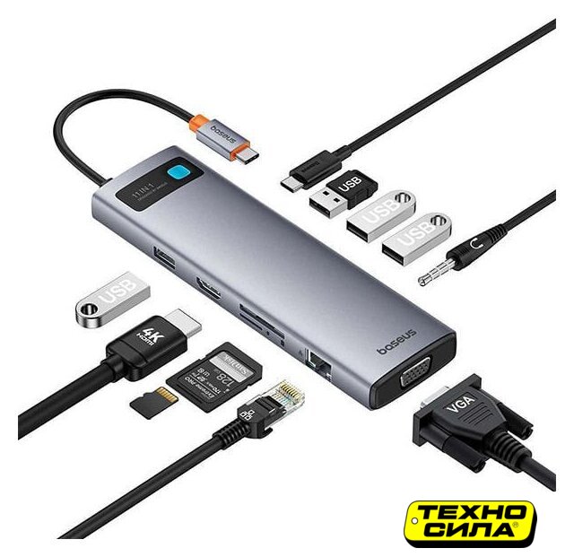 | Все разъемы на адаптере | USB-A 3.2 Gen1 (5 Гбит/с), USB-A 2.0, HDMI, VGA, RJ-45, USB-C (только для зарядки), 3.5 мм jack |