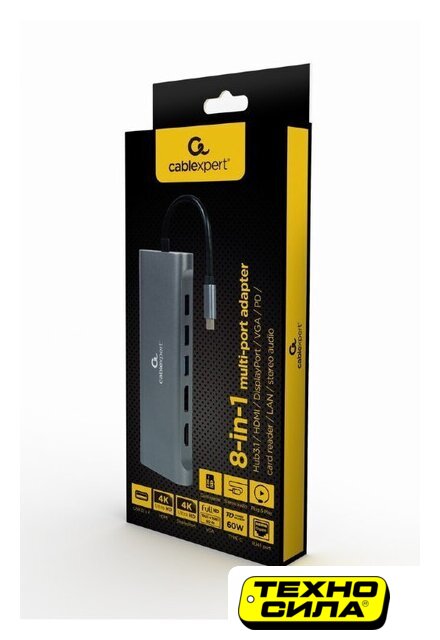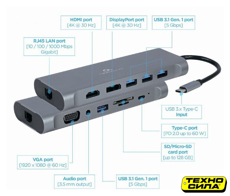 USB Type-A 3.2 Gen1 (5 Гбит/с)/USB Type-C/HDMI/VGA/3.5 мм jack, 4 порта, 1 x USB Type-C, 3 x USB Type-A, пассивное питание, картридер SD/microSD, кабель 0.15 м, цвет серый