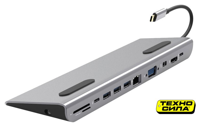 подключение по USB-C, 4 x USB-A, 1 x USB-C, видео до 4K 30 Гц, питание USB-C PD до 60 Вт, LAN-адаптер 1000 Мбит/с, кардридер, корпус металл