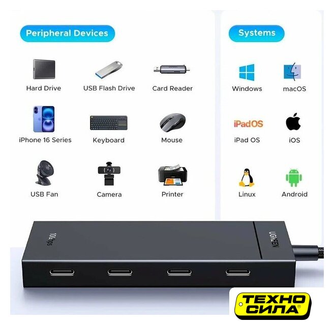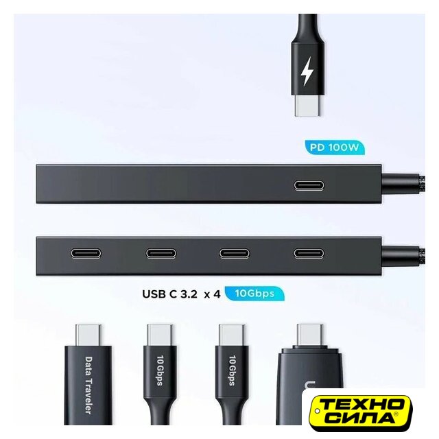 подключение по USB-C, 4 x USB-A, корпус пластик