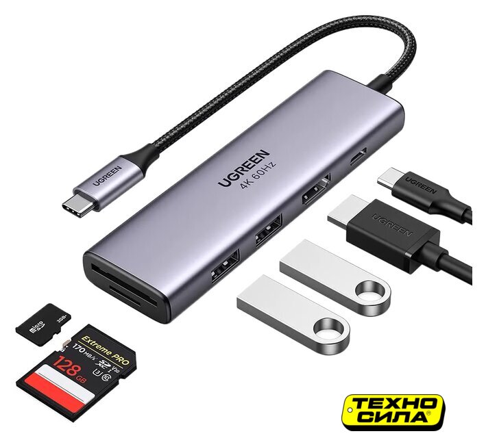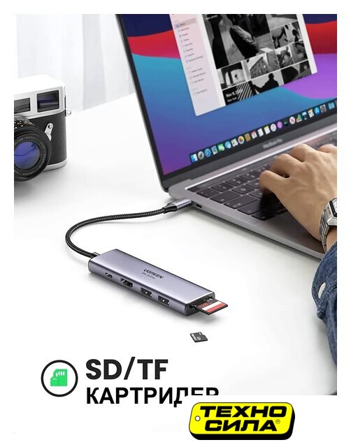 USB Type-A 3.2 Gen1 (5 Гбит/с)/USB Type-C/HDMI, 3 порта, пассивное питание, картридер SD/SDHC/SDXC/microSD/microSDHC/microSDXC, цвет серый