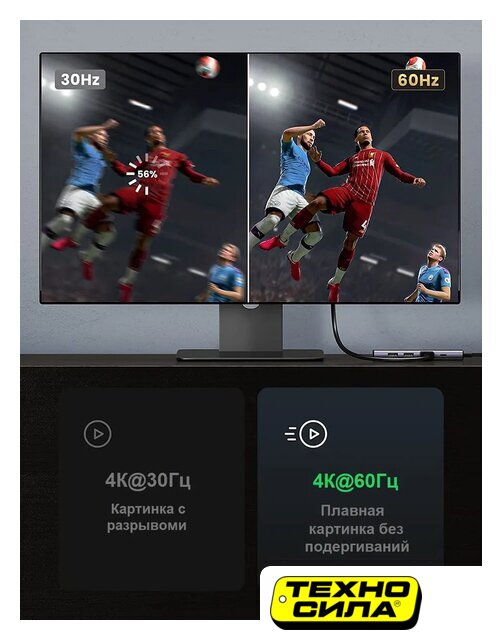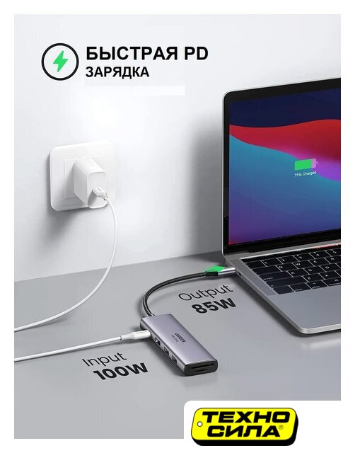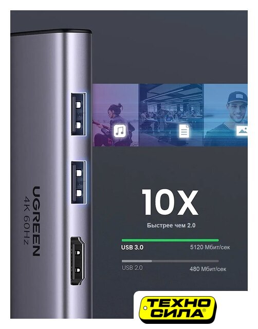 подключение по USB-C, 4 x USB-A, видео до 4K 30 Гц, питание USB-C PD до 60 Вт, LAN-адаптер 1000 Мбит/с, корпус пластик