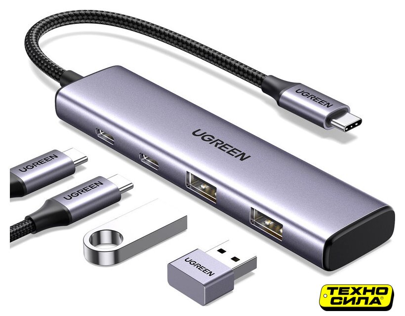 USB Type-A 3.2 Gen1 (5 Гбит/с)/USB Type-C, 4 порта, комбинированное питание, кабель 0.2 м, цвет серый