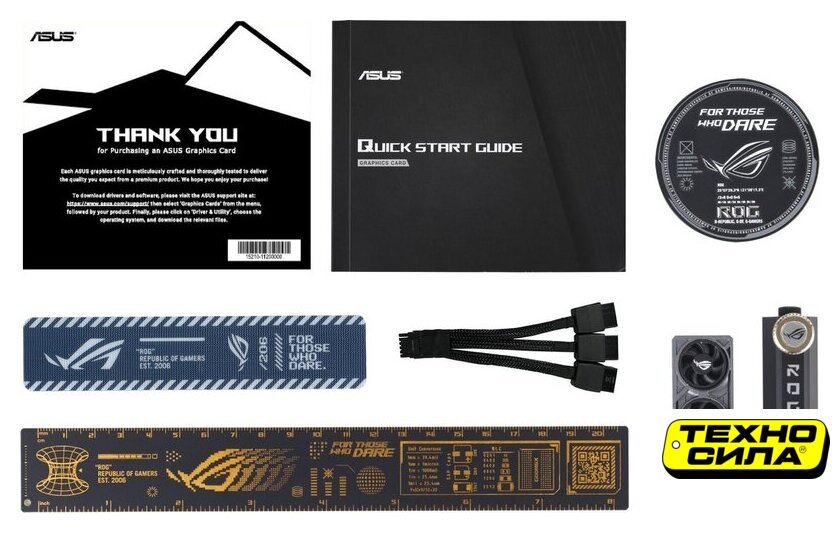 Комплект поставки | 1 x Speedsetup Manual1 x ROG Graphics Card Holder1 x ROG Velcro Hook & Loop1 x ROG Magnet1 x ROG Graphics Card Keycap1 x ROG PCB Ruler1 x Thank You Card1 x Adapter Cable (1 to 3) |