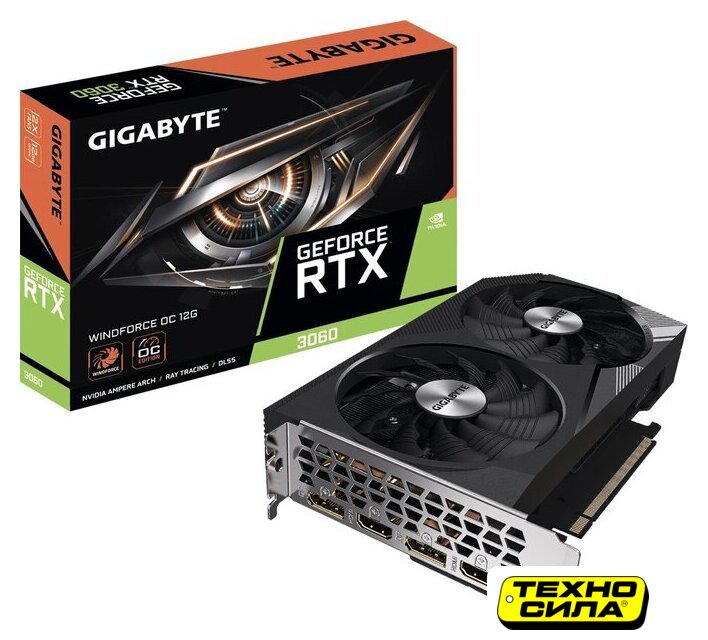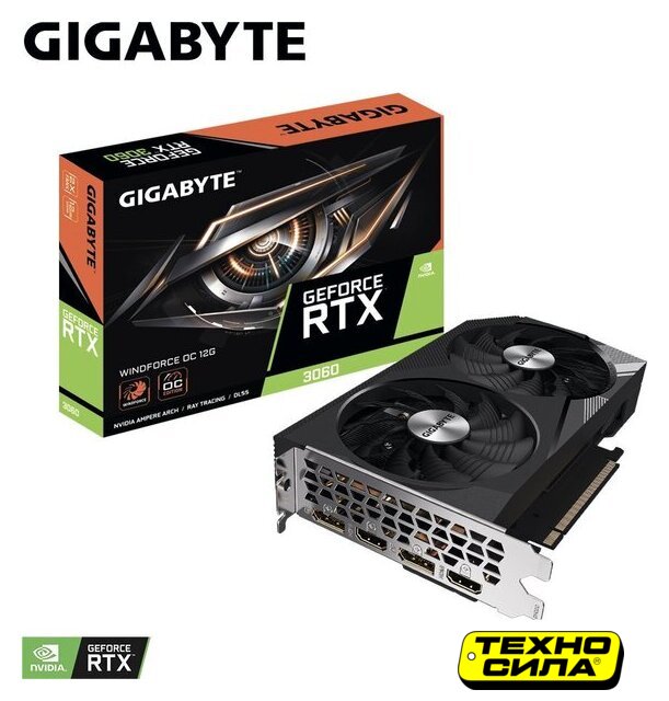NVIDIA GeForce RTX 3060, базовая частота 1777 МГц, 3584sp, частота памяти 15000 МГц, 192 бит, доп. питание: 8 pin, 2.2 слота, HDMI, DisplayPort