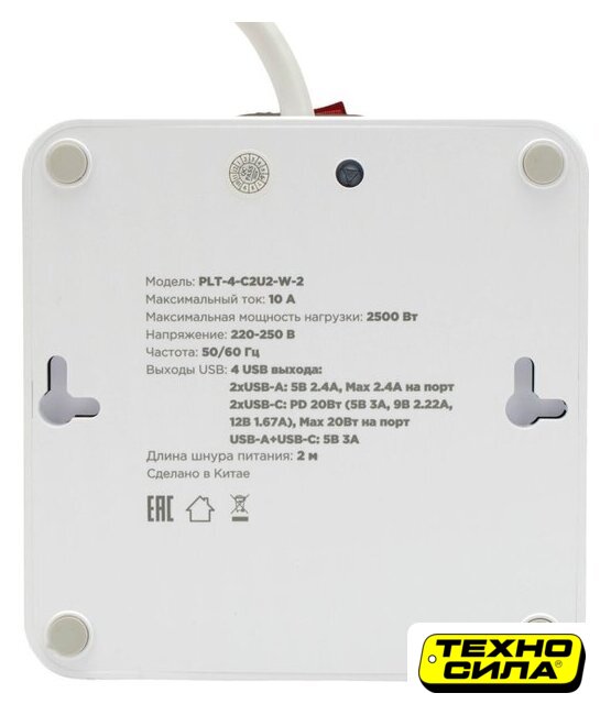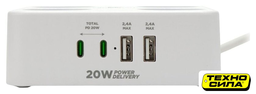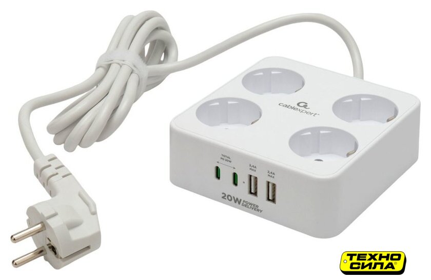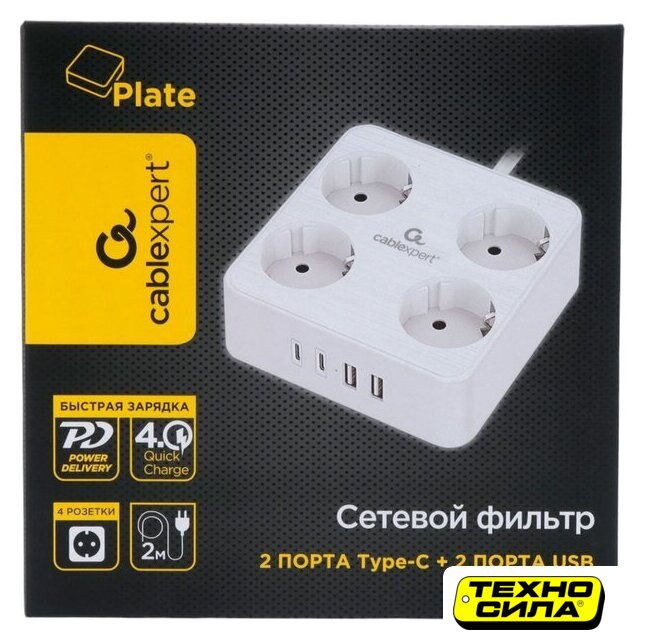 сетевой фильтр, кабель 2 м, 4 розетки Schuko (евро с заземлением) / 2500 Вт/USB