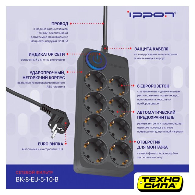 блок распределения питания, 9 розеток евро с заземлением / 3250 Вт