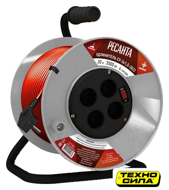 удлинитель, 30 м, 4 розетки евро с заземлением / 3500 Вт